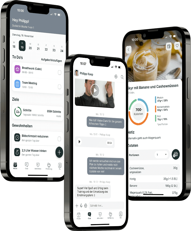 Deine Pläne werden regelmäßig an deine Fortschritte angepasst – anhand von Maßen, Gewicht und aktuellen Bildern – und zusätzlich bekommst du praktische Tipps und Rezepte, die sich direkt in deinen Alltag integrieren lassen.